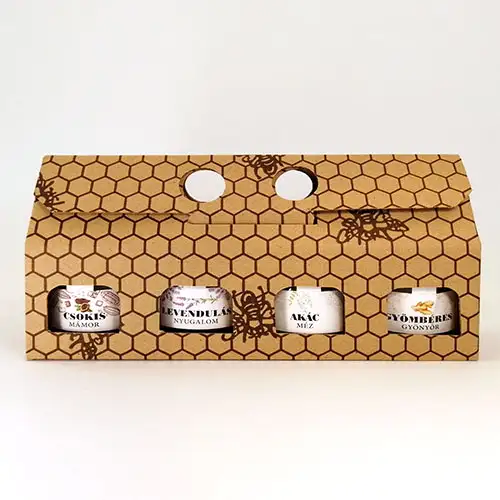 Egy masnival átkötve a négy mézecske mindenkinek tetszeni fog, ráadásul a kartondoboz megfizethetó ára miatt elérhető akár nagyobb számban is. Kollégák, munkatársak, pedagógusok, távolabbi családtagok is kaphatnak egyet-egyet, úgy is, hogy akár mindenki másfélét kap - attól függően hogy milyen mézeket válogatunk össze.